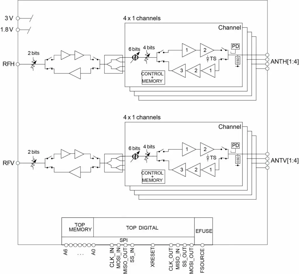 The PE188100 is an 8-channel beamforming front end for 5G applications. It is organized as two independently controllable RF chains of four channels supporting four dual-polarity antennas or eight single-polarity antennas. Time division duplex (TDD) mode operation switches power amplifier/low noise amplifier (PA/LNA) branches connected to each antenna port. Integrated splitter/combiners and a phase and […]