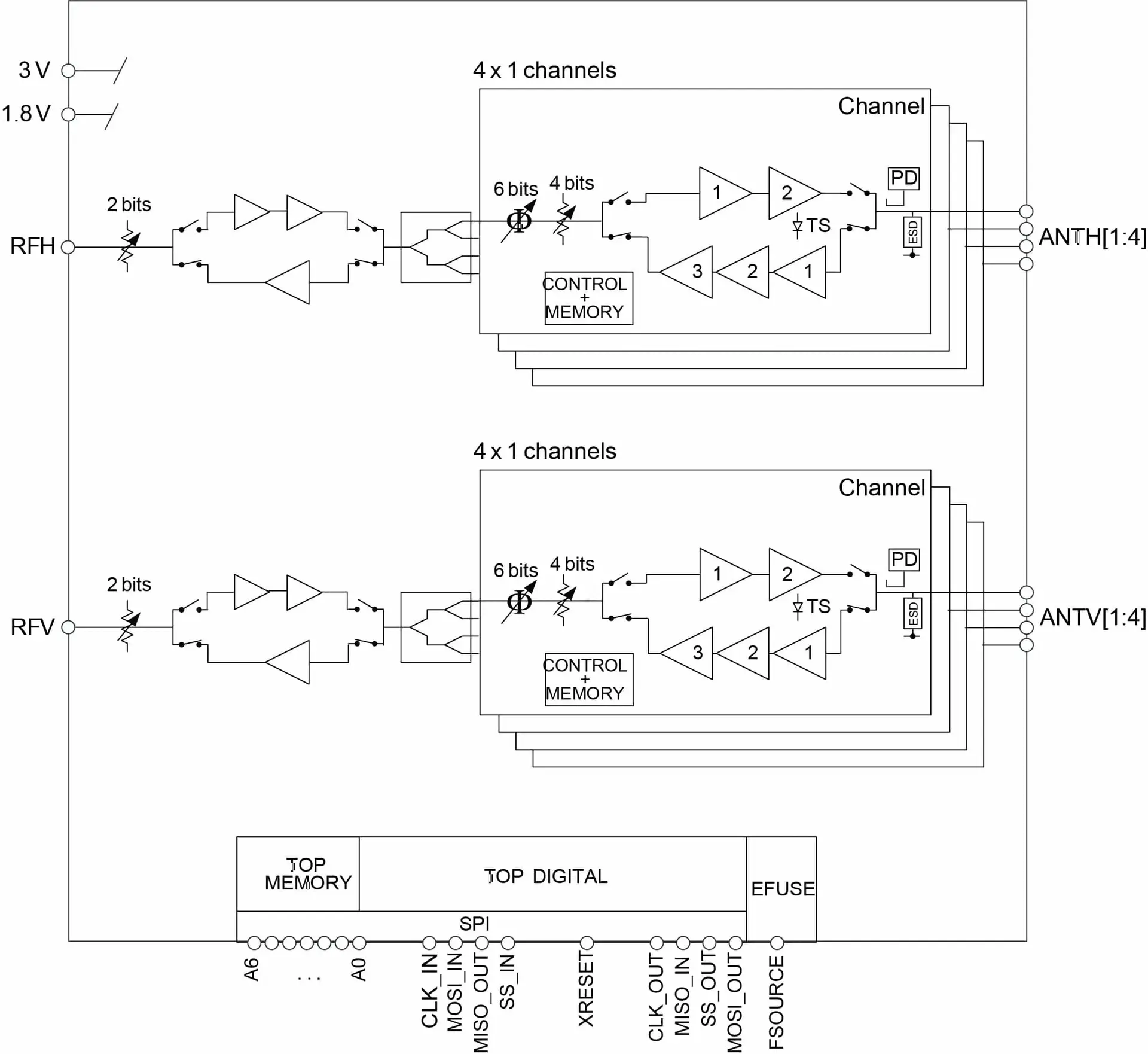 The PE188100 is an 8-channel beamforming front end for 5G applications. It is organized as two independently controllable RF chains of four channels supporting four dual-polarity antennas or eight single-polarity antennas. Time division duplex (TDD) mode operation switches power amplifier/low noise amplifier (PA/LNA) branches connected to each antenna port. Integrated splitter/combiners and a phase and amplitude beamformer for each channel complete each chain.